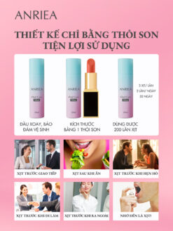 . Thiết kế nhỏ gọn chỉ bằng một thỏi son, tiện lợi mang đi bất cứ đâu. Xịt khi ra ngoài, xịt khi hẹn hò, xịt khi nhớ đến,… và trong vô vàn tình huống khác khi luôn muốn có sự thơm tho, tự tin thi hãy lấy Xịt Thơm Miệng Anriea để xịt nhé.